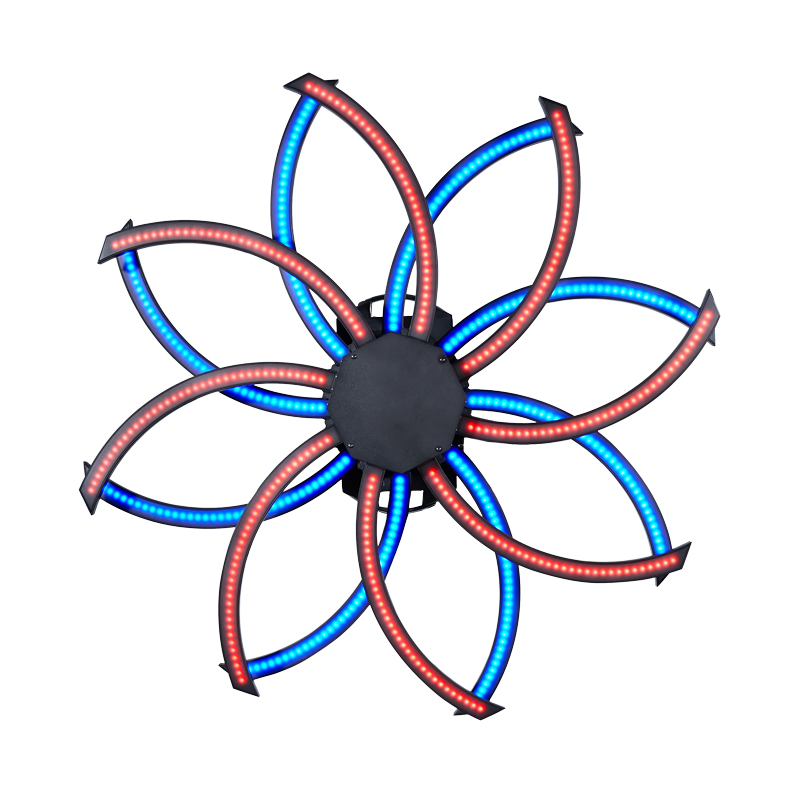 特点:灯条叶片插拔式设计,安装方便快捷,每个灯条叶片12个像素点,上下两层可独立双向旋转及调速,并独立调节颜色